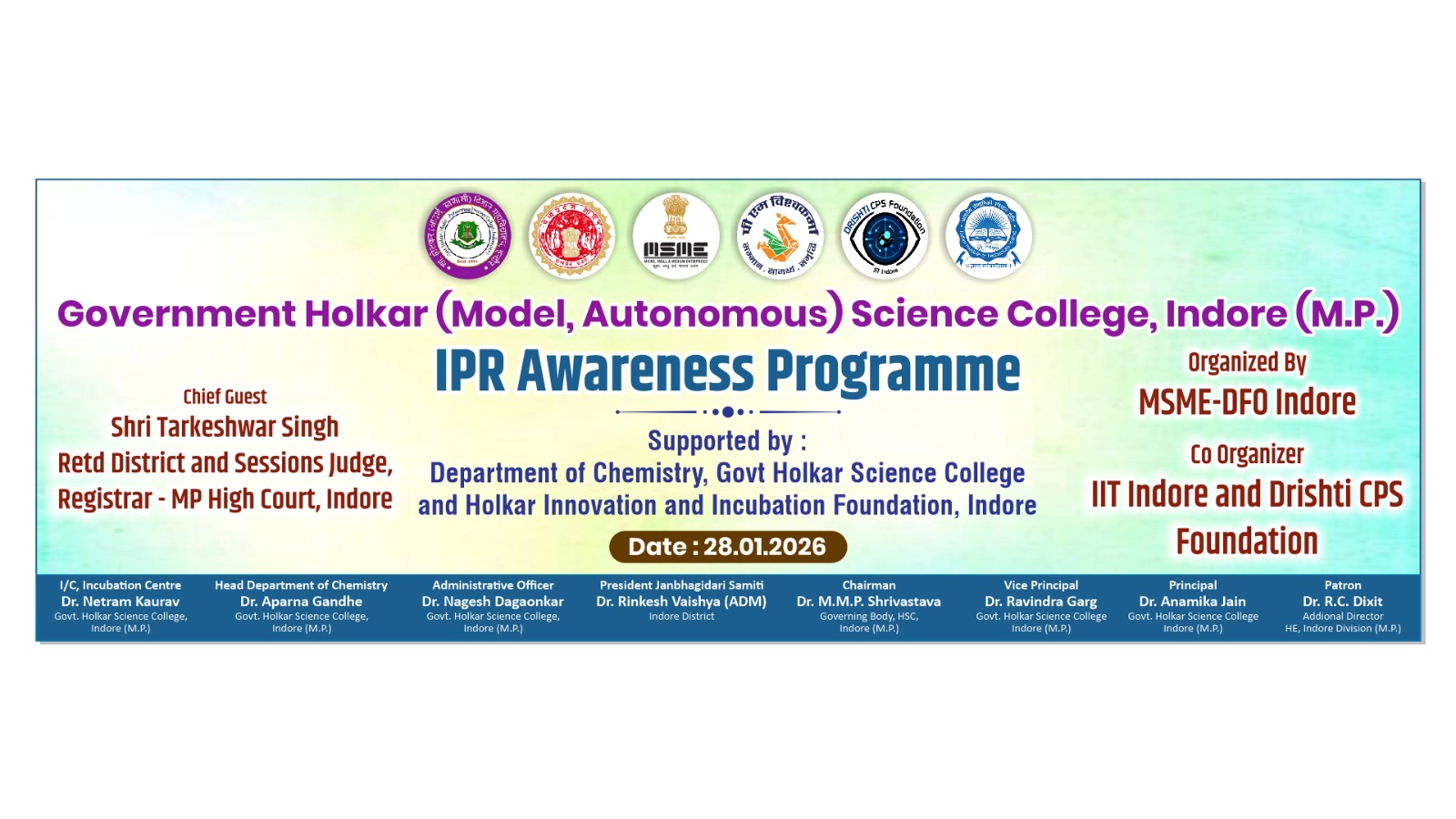 The program is being organized by MSME-DFO Indore, in collaboration with IIT Indore and Drishti CPS Foundation, and supported by the Department of Chemistry, Government Holkar (Model, Autonomous) Science College, Indore, and the Holkar Innovation and Incubation Foundation, Indore.